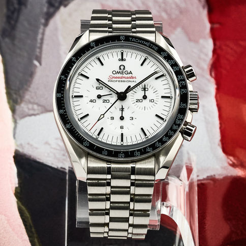 The Omega Speedmaster Moonwatch Professional in its striking white dial variation blends timeless space exploration heritage with a bold, modern look. The 42mm steel case, manual-winding movement, and 50-hour power reserve make it a precision tool for everyday wear, while the steel bracelet adds versatility. A complete 2025 set, showing minor wear but running strong.